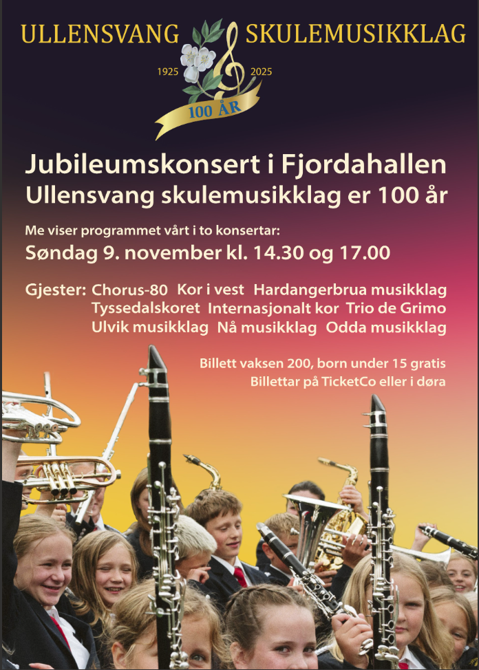 Ullensvang skulemusikklag er 100 år og inviterar til jubileumskonsert i Fjordahallen. Med som gjester er blant anna Hardangerbrua musikklag.