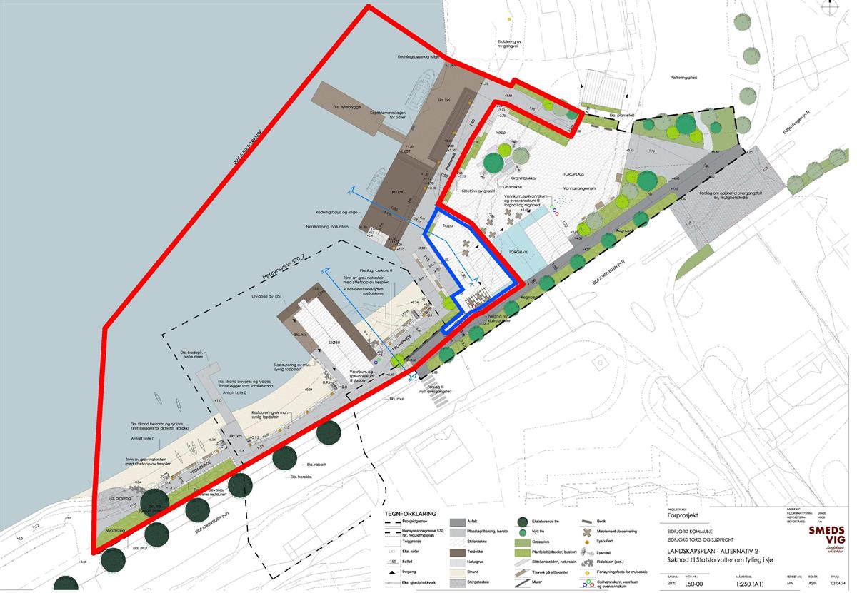 Byggjetrinn 1 er markert med raud linje, alt utanfor dette vil ikkje verta opparbeida i denne omgang. Innanfor blå linje vil området verta klargjort i form av utfylling og terrengtilpassing for å kunne laga den utvida promenaden, men vil ikkje verta opparbeida som torgplass før byggjetrinn 2.