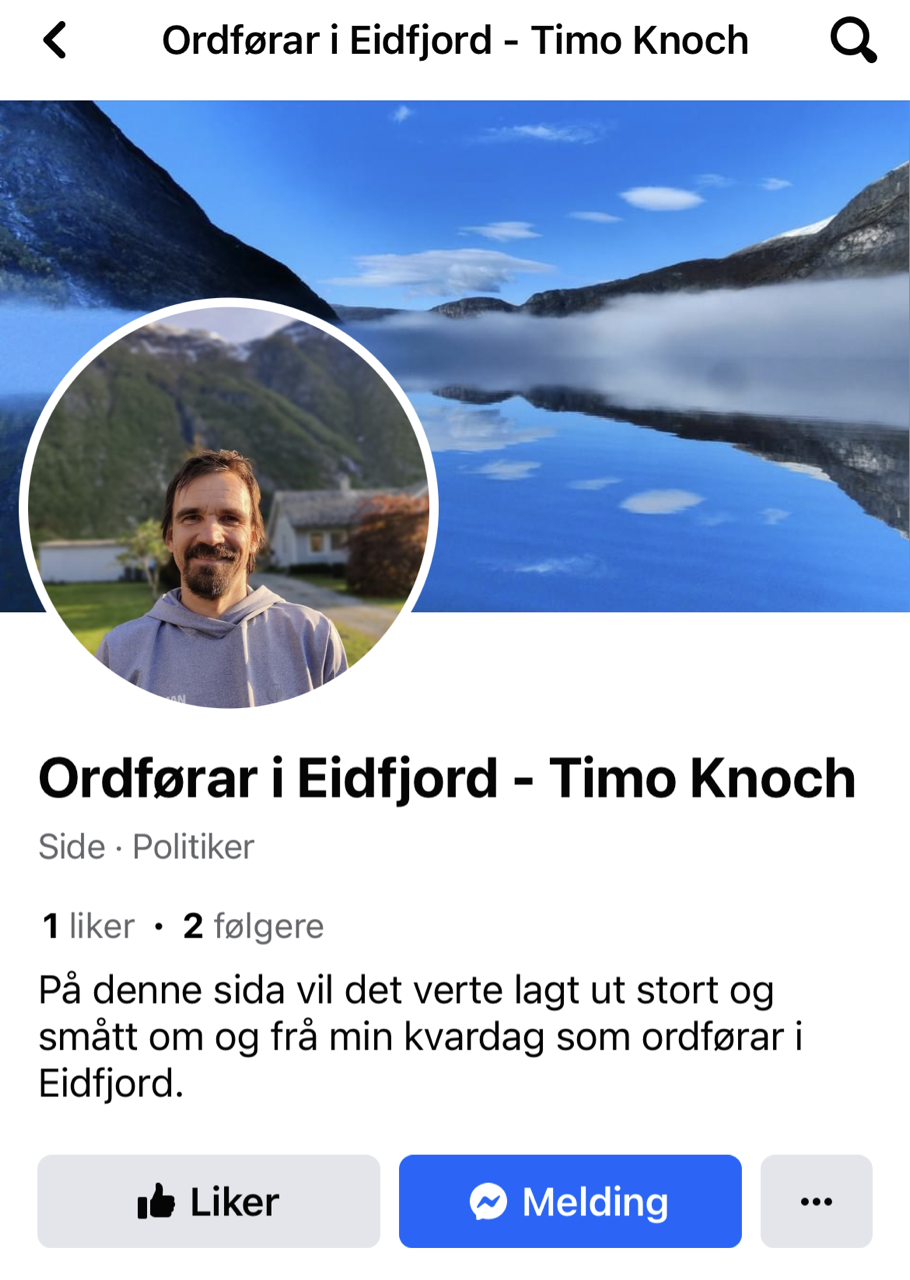 Er du nysgjerrig på ordføraren sin kvardag? Ordførar i Eidfjord, Timo Knoch, har oppretta si eige sida på facebook. Søk opp Ordførar i Eidfjord - Timo Knoch på din facebook profil, og følg kvardagen hans. Publisert 14.11.2023 14.11 Sist endra 14.11.2023 14.11 Ordførar i Eidfjord, facebook